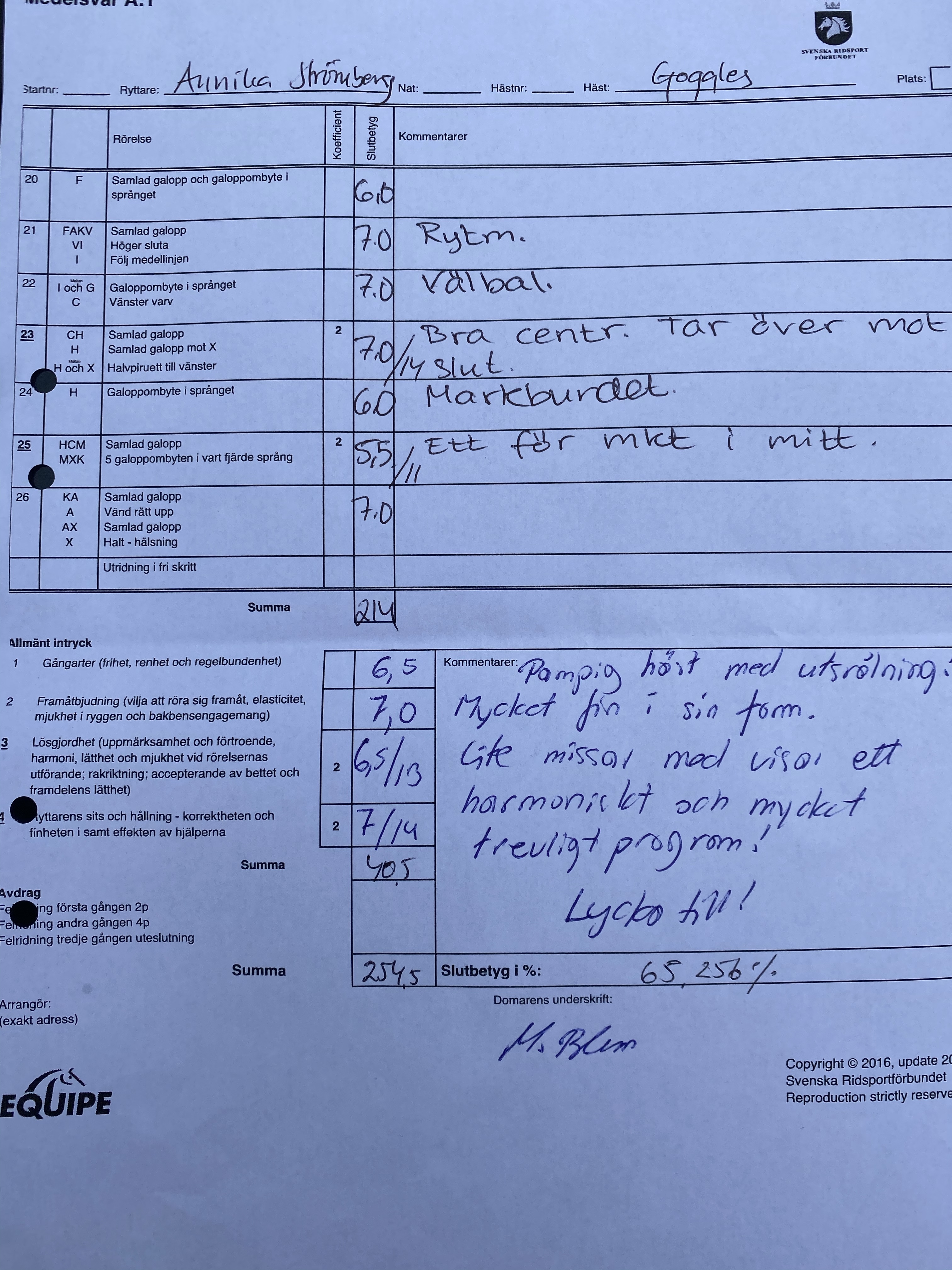 Så vi red igenom programmet, fick några missar tex fattade galopp efter travökningen, miss i serien då jag var sen. Ena piruetten blev stor och den andra mycket bättre med gick ur form lite sista steget.