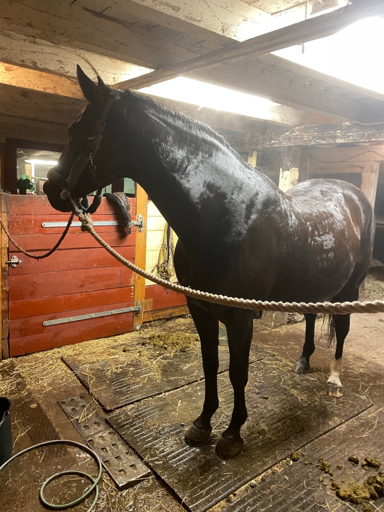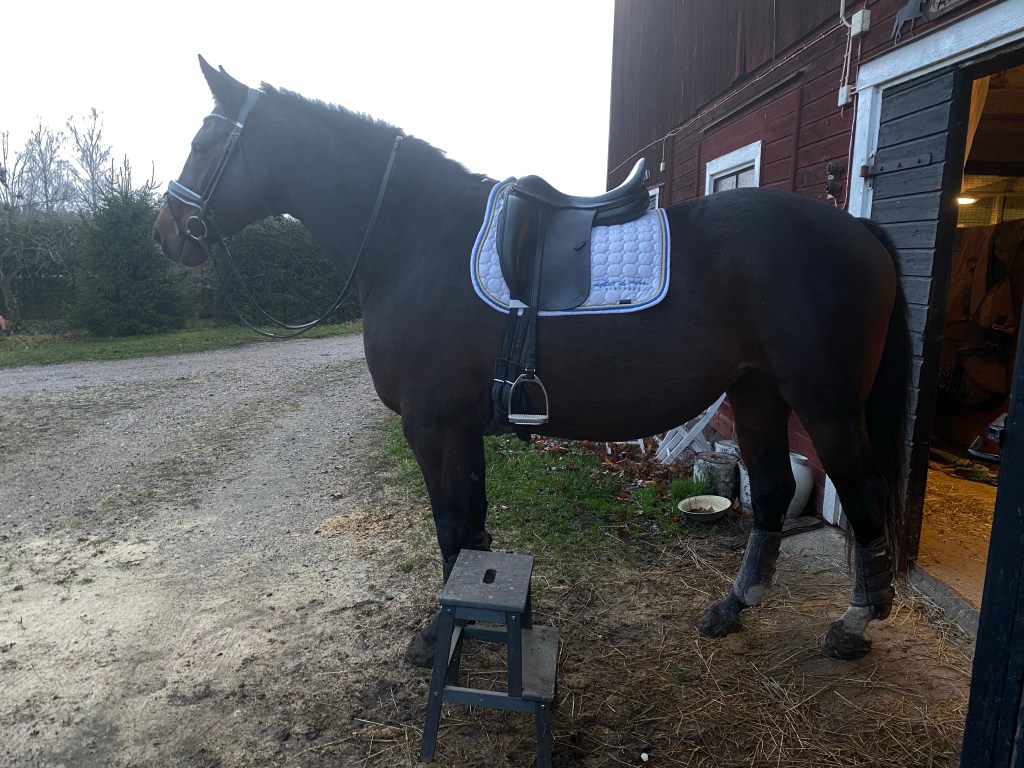 I förrgår tog vi ett pass på banan och hon kändes riktigt fin i travjobbet. Lugn och med fin takt i traven. I galoppen blir hon lite stressad och tror att vi ska byta lite nu och då fast vi inte gjort nåt byte ens. Så vi har lite att jobba med framöver med att försöka få henne mera lösgjord och avspänd.