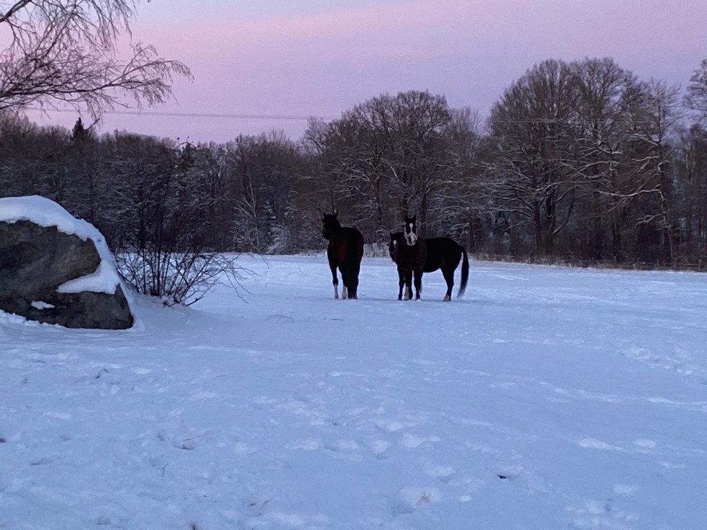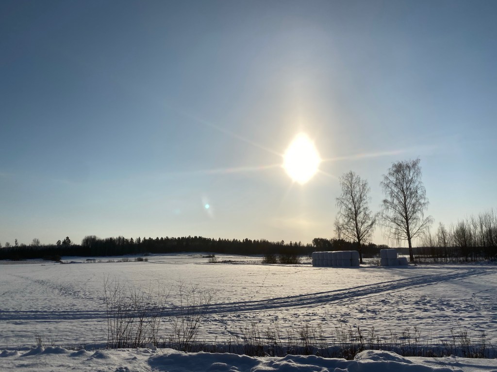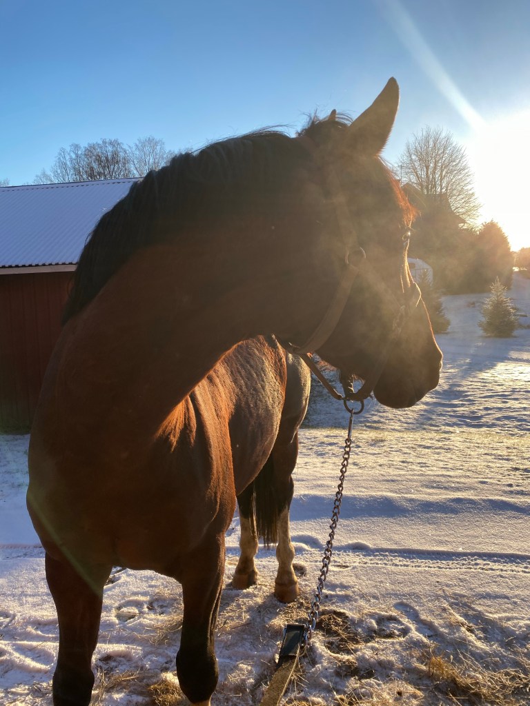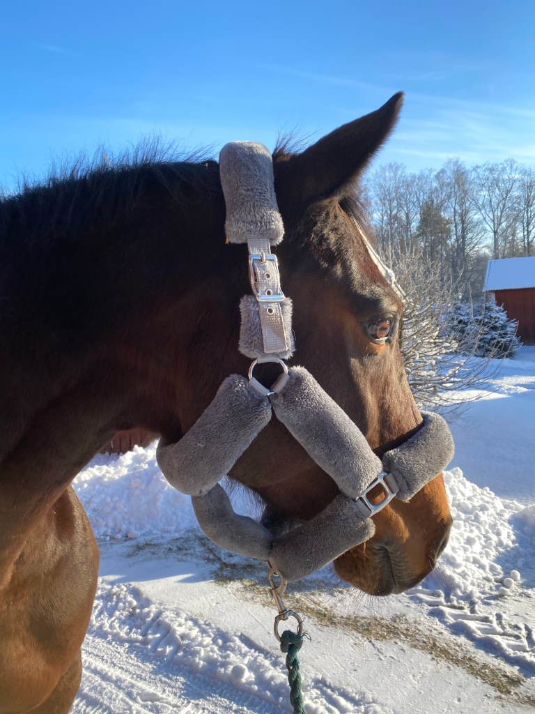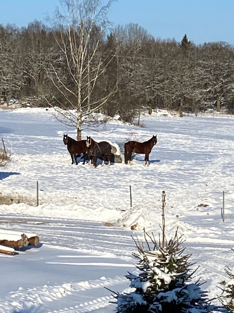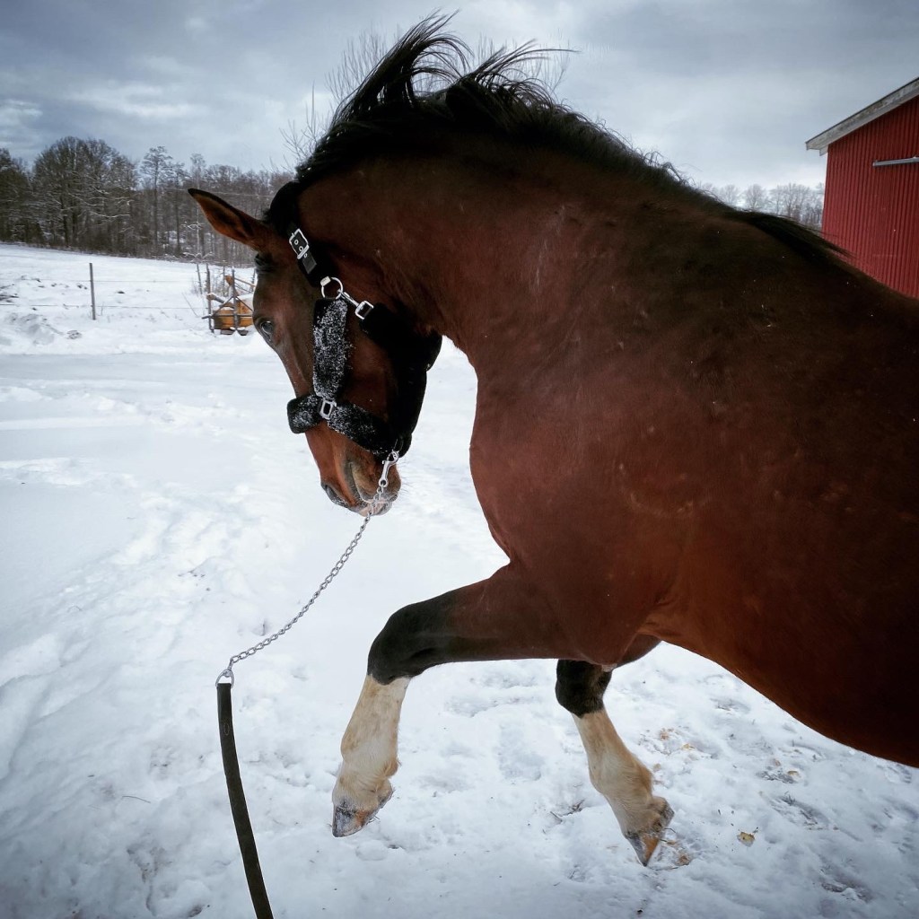 Just nu har vi ju fått vinter ordentligt. Här har varit ner mot -20 på nätterna och rätt kallt på dagtid också. Men strålande sol som faktiskt värmer litegrann nu. Ljuvligt! 🌞 Ca 2 dm snö här och ridbanan som var isig innan snön kom, är inte ok rida på nu. Snön frös liksom inte fast eftersom det inte kom nån blötsnö på isen utan en massa fluffig puder bara. Så har fått jogga Goggles nere i lilla hagen. Spännande upplevelse då han gärna brallar och bockar 😂