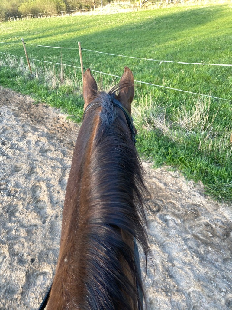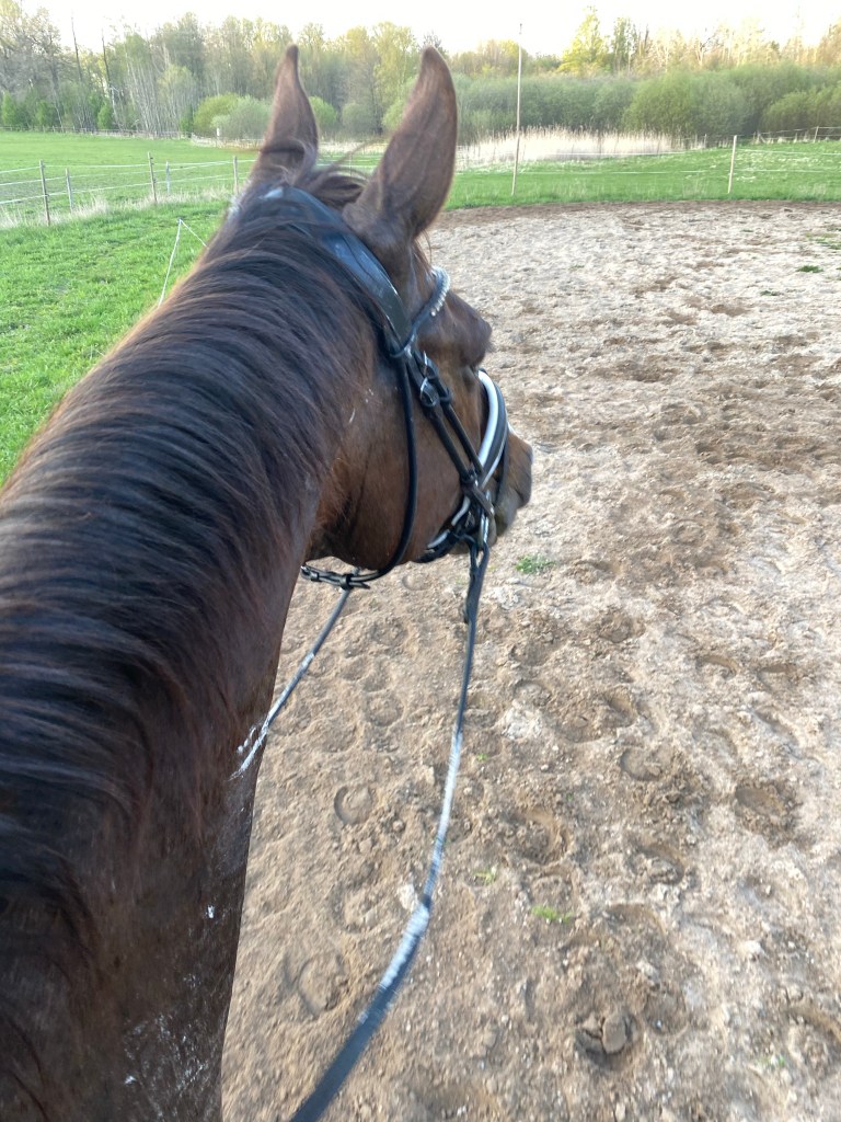 Har ridit ett pass på Goggles ikväll på banan och han kändes pigg och glad. Jobbade med att hitta lite mera samling i öppnorna utan att han spänner till och blir för luftig i traven. Sedan jobbade vi lite med skänkelvikningar och slutor i galopp så jag inte glömmer bort att ha kontroll varje steg, med små tempoväxlingar i rörelserna för att aktivera hela tiden då det inte blir mellanmjölk av alltihopa 😂