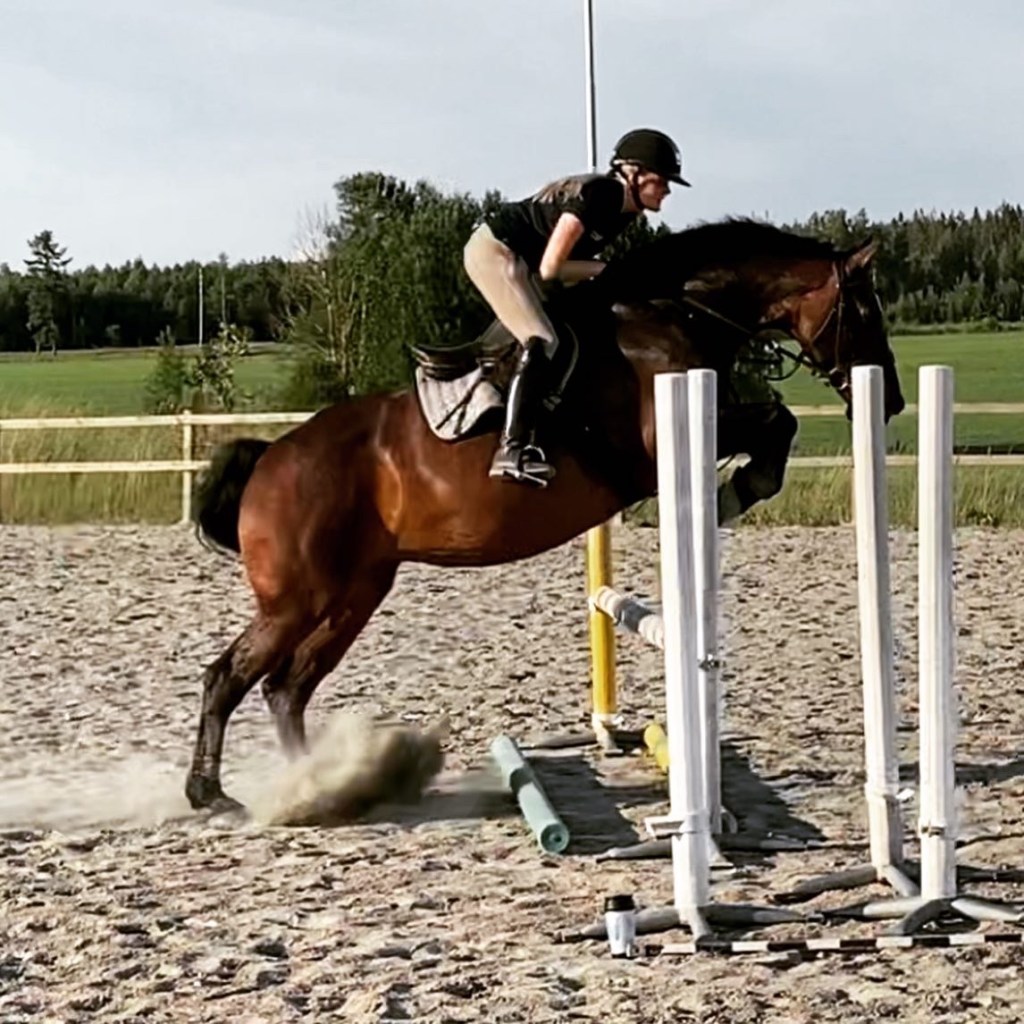 Mocca är rätt känslig och het, finns många fartresurser i den damen. Däremot behöver man tordas rida igenom den känsligheten trots att hon blir framåt, man får liksom rida mer men inte fortare eller hastigare, utan mera ridning så man kommer till lösgjordheten. Annars springer hon och luras men det blir liksom helt tomt i handen. Men det tar lite tid att lära sig, speciellt om man ridit andra typer av hästar innan. Erika gör det jättebra och är mjuk och försiktig med Mocca. 😍