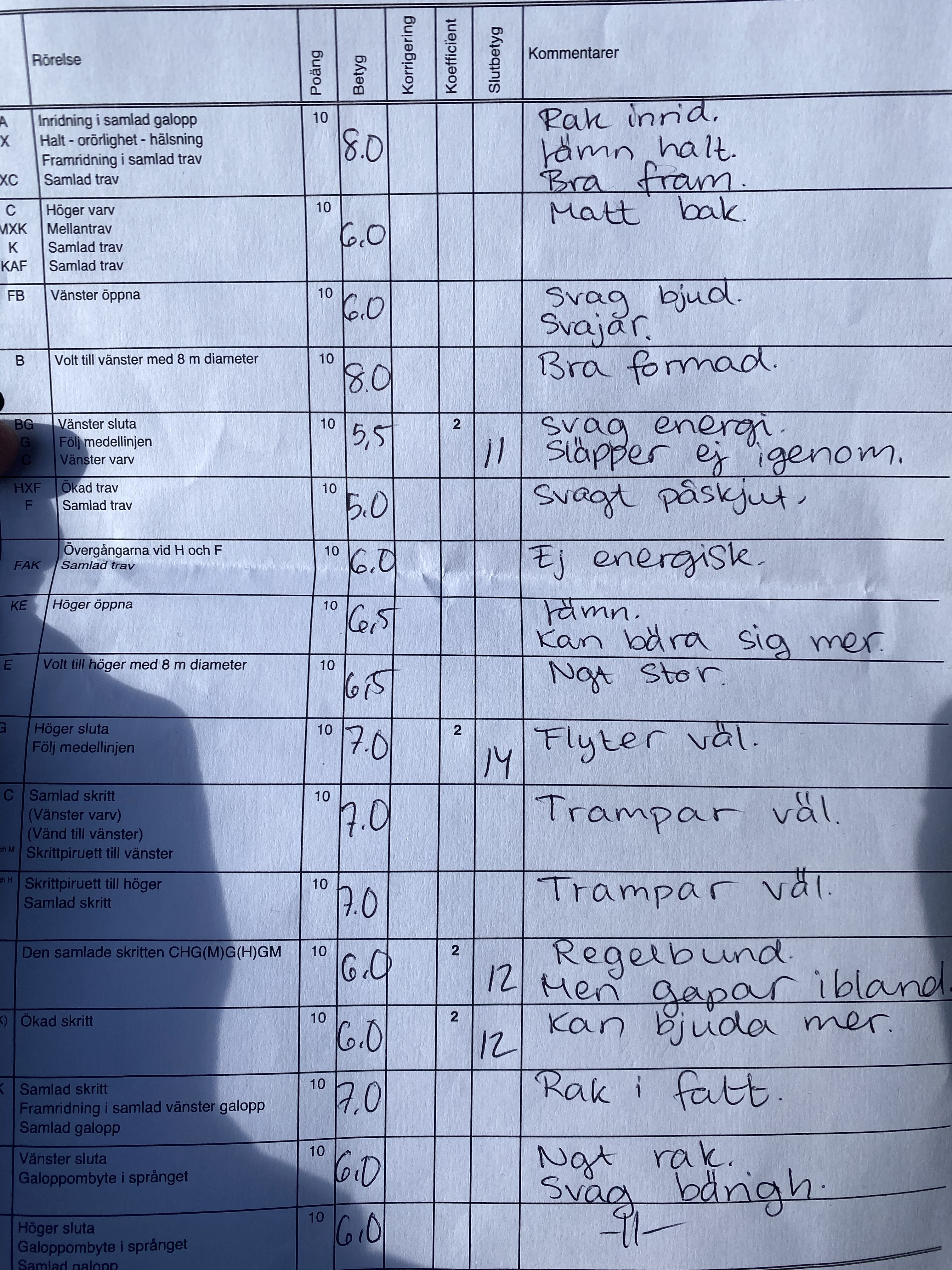 Skrittpiruetterna bra och han höll takten bra i samlade skritten. Den kan lätt bli spänd och tappa fyrtakten, ökade skritten lite kort. Fattningen ok sen var jag sen och förberedde inte galoppslutorna tillräckligt, fick ett mindre bra hörn och var inte riktigt förberedd. Så kom ut vid X gjorde ok byte men blev sen på nästa sluta istället. Bytet efter var ok. Inför första piruetten slog han ifrån sig när jag samlade och förberedde men tog drivningen bra, tjurade inte, och kunde vända hyfsat bra ändå. Bytet på kortsidan ok. Nästa piruett blev väl lång förberedelse på och den blev stor, han slog om innan spåret men korrigerade och bytte tillbaka så att vi kunde göra ett riktigt byte vid C. Första serien, fyrorna, tog han första men inte andra bytet så blev bara 3 byten o inte så bra. Red fram ordentligt och tänkte att nu jäklar- nästa diagonal så ska han gå fram. Och treorna satt helt ok. Inte helt raka men rena och på hjälperna! 💪Galoppökning ok, uppridningen stod han emot så jag fick rida allt vad tygen höll för han inte skulle lägga av. 😂