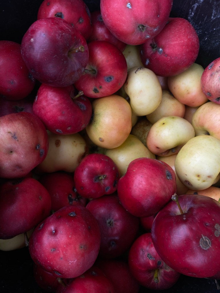 Så gick och hämtade en hink till med Oranier och Lobo. Oranier är lite mjöliga äpplen och personligen tycker jag inte dom är så goda att äta, jag vill hellre ha fasta äpplen. Lobo är de riktigt riktigt röda- som Snövitäpplen liksom. Torkar man av dem så blir de alldeles blanka och ser vaxade ut. Tyvärr så har det varit rönnbärsmal (tror jag de heter) och käkat så det är svarta prickar och maskgångar i alla Lobo 😫 men hästarna uppskattar dom för det.