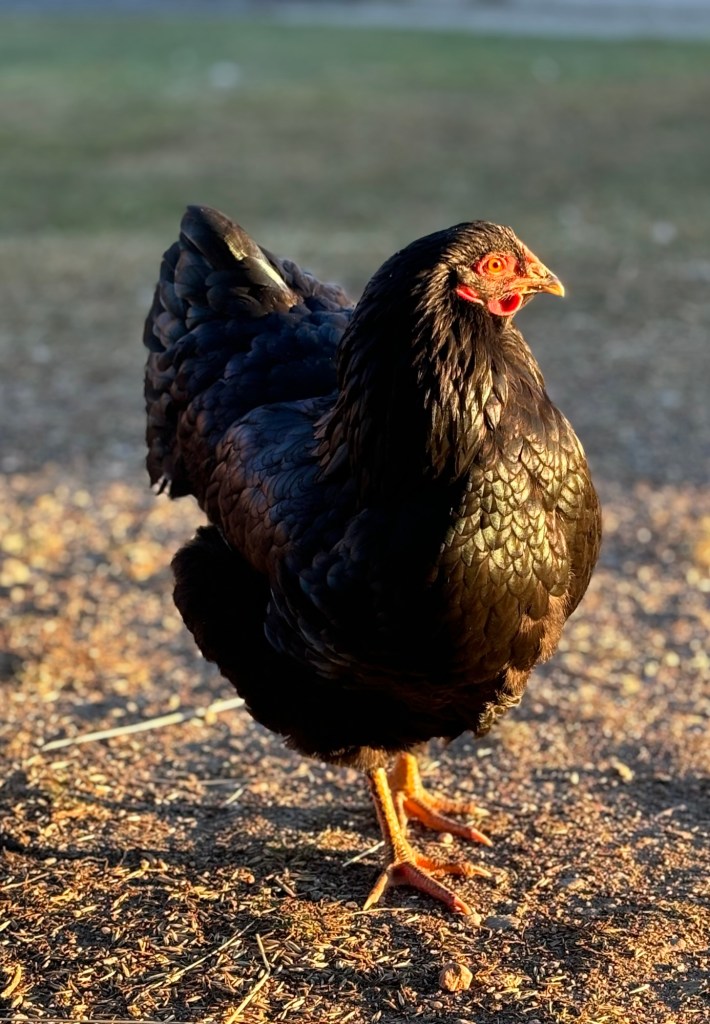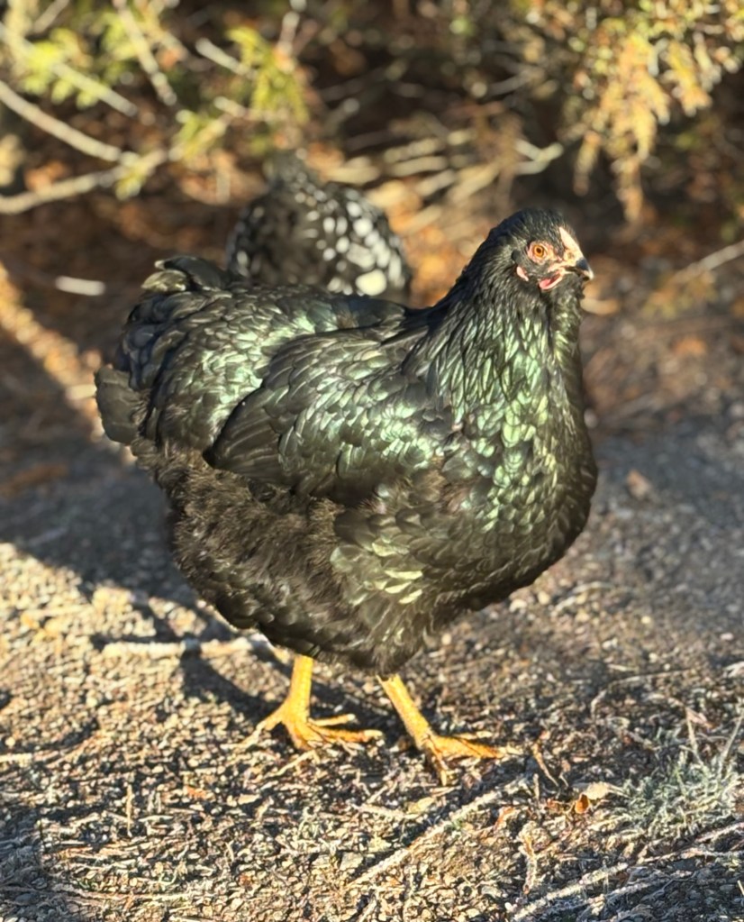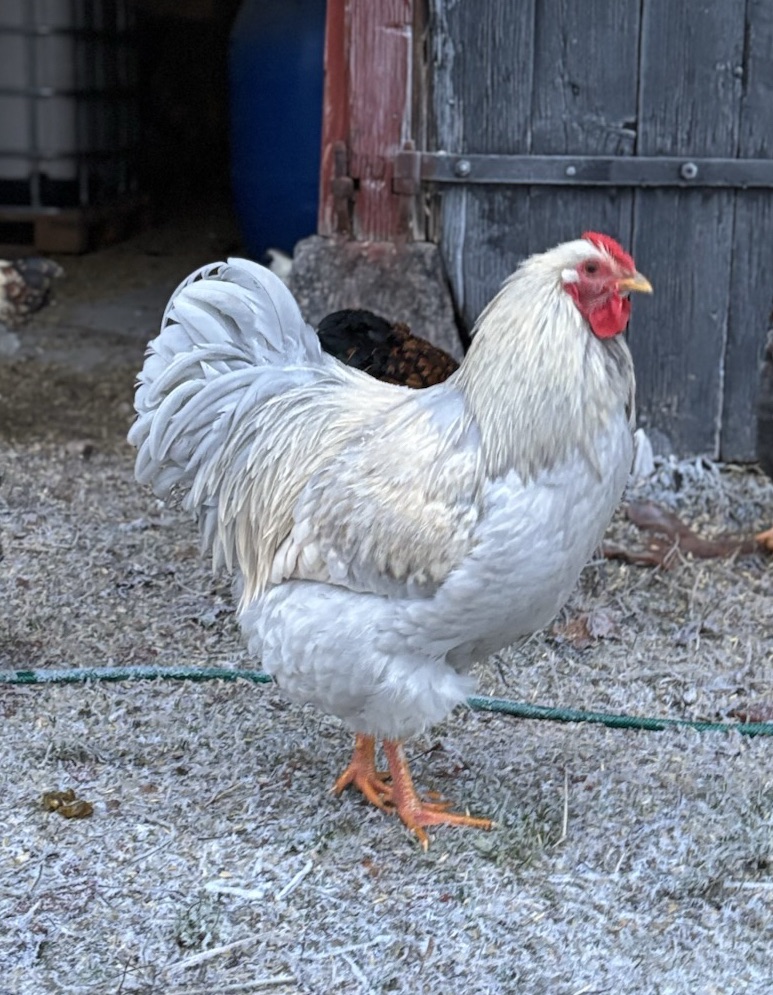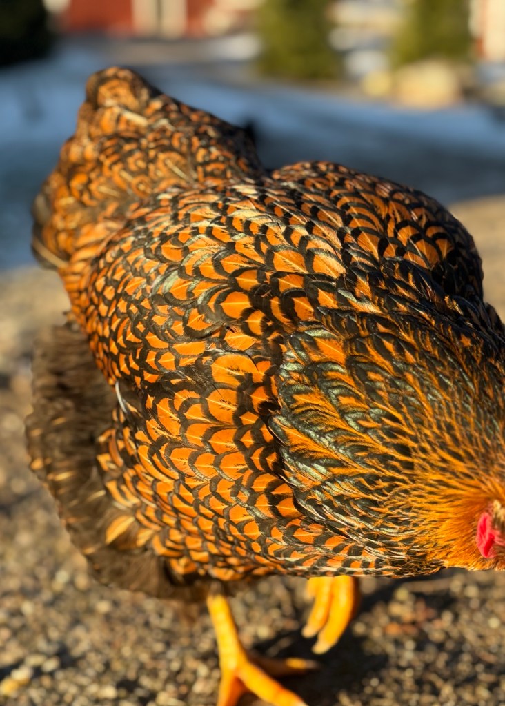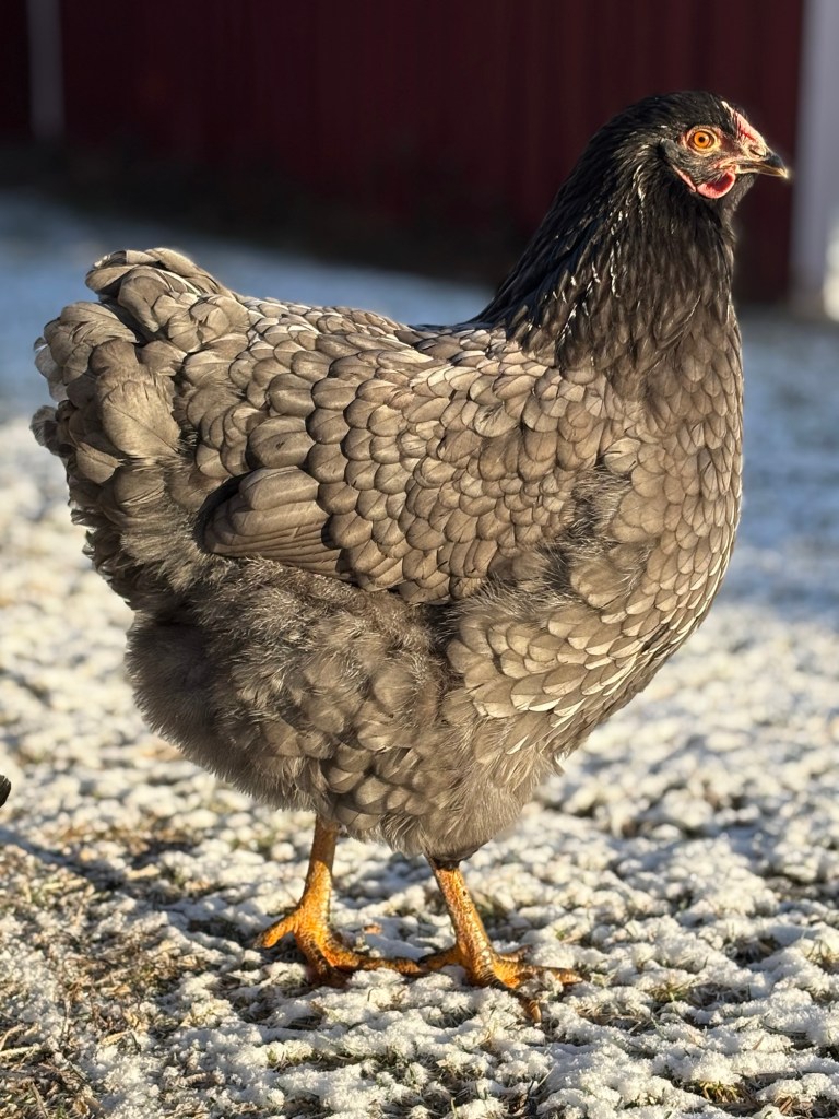 Kycklingarna växer så det knakar. Det är två kullar, en med 5 st som är äldst. Där blev det 2 tuppar och 3 hönor. Här är en av hönorna. Dessa är blandning av 75% wyandotte och 25% nåt helt odefinierbart haha Tofs på huvudet och troligen lite grönvärpargener. Vi får väl se 🤩