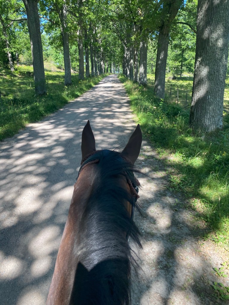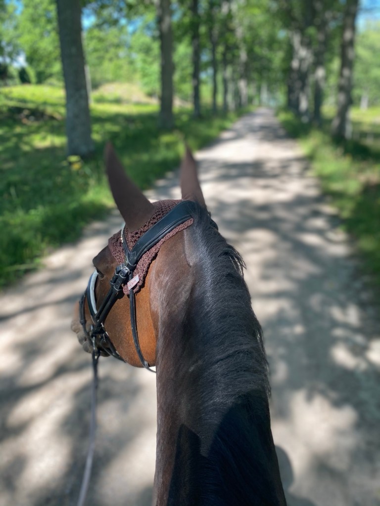 Vi jobbade med egentligen allt som vi gjort förut men i lite kortare sekvenser för att orka. Vi jobbade med bakdelsvändningar, att växla mellan olika sorters skritt. Lite öppnor och slutor i trav, galoppslutor och byten. Vi fick även samla traven lite mer på slutet och då kommer den härliga traven med mycket schwung. Den traven där det rör sig genom ryggen på honom och jag kan slappna av och bara fokusera på att gunga med i rörelsen och försöka vara mjuk men stabil i kroppen själv. Jag får liksom känslan av passage och att vi lyfter för varje steg.