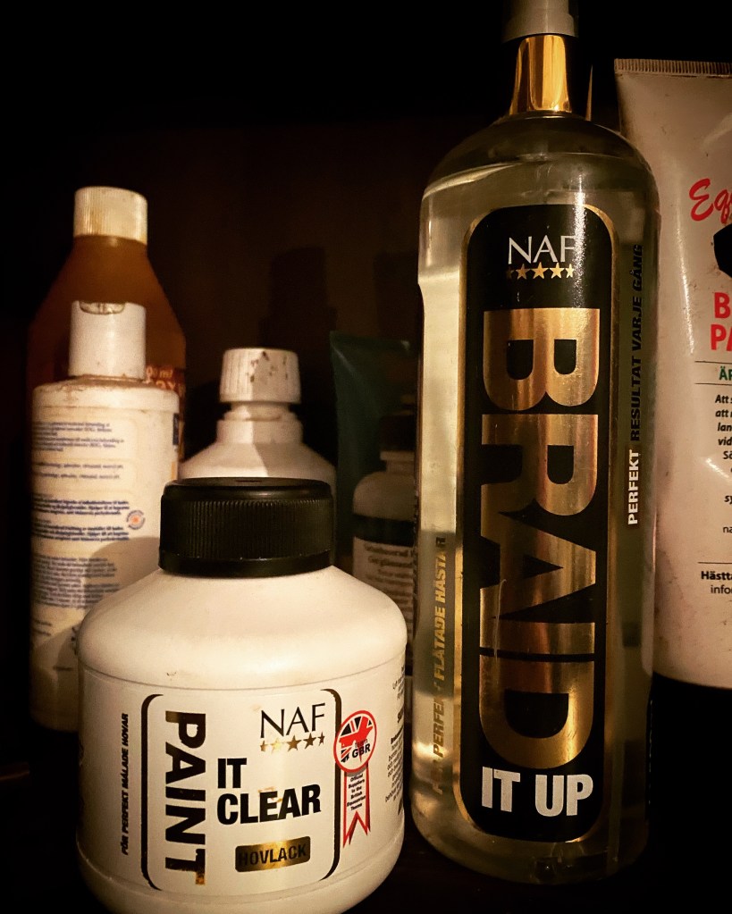 Till extra finish och tävlingsprepp är det dessa två från NAF. Hovlack och flätspray. 👍 superbra båda två!! För att få hovarna snygga så blöter jag dem först, gnuggar sedan med en disksvamp och schampo/såpa så de blir rena och släta innan de får torka och sedan lack på.