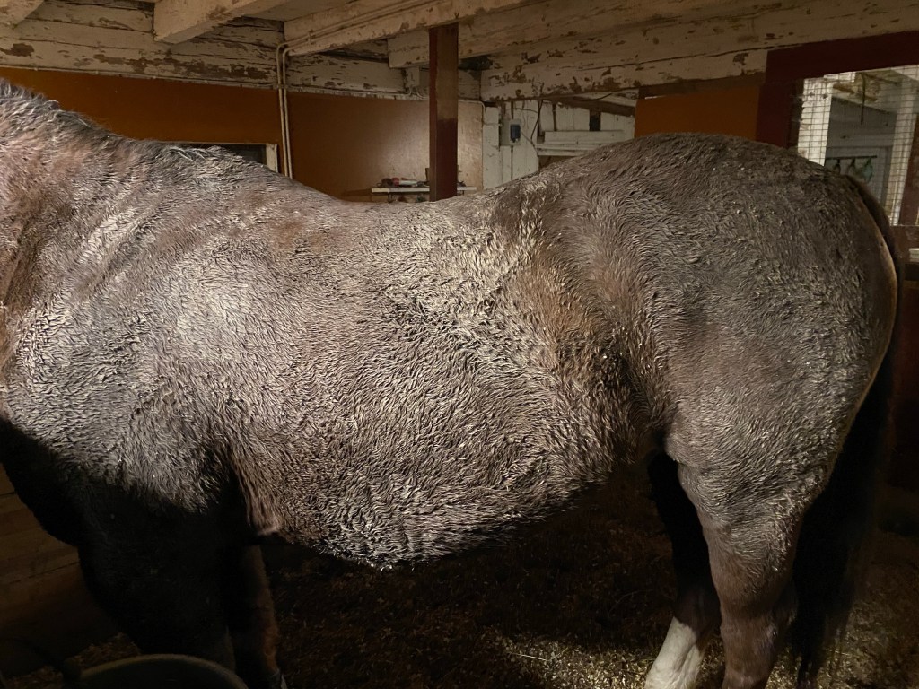 Så han fick en omgång med vattenslangen så han såg skaplig ut på morgonen när jag tog av täcket. Så då var det bara borsta av lite spån och åka sen 👍