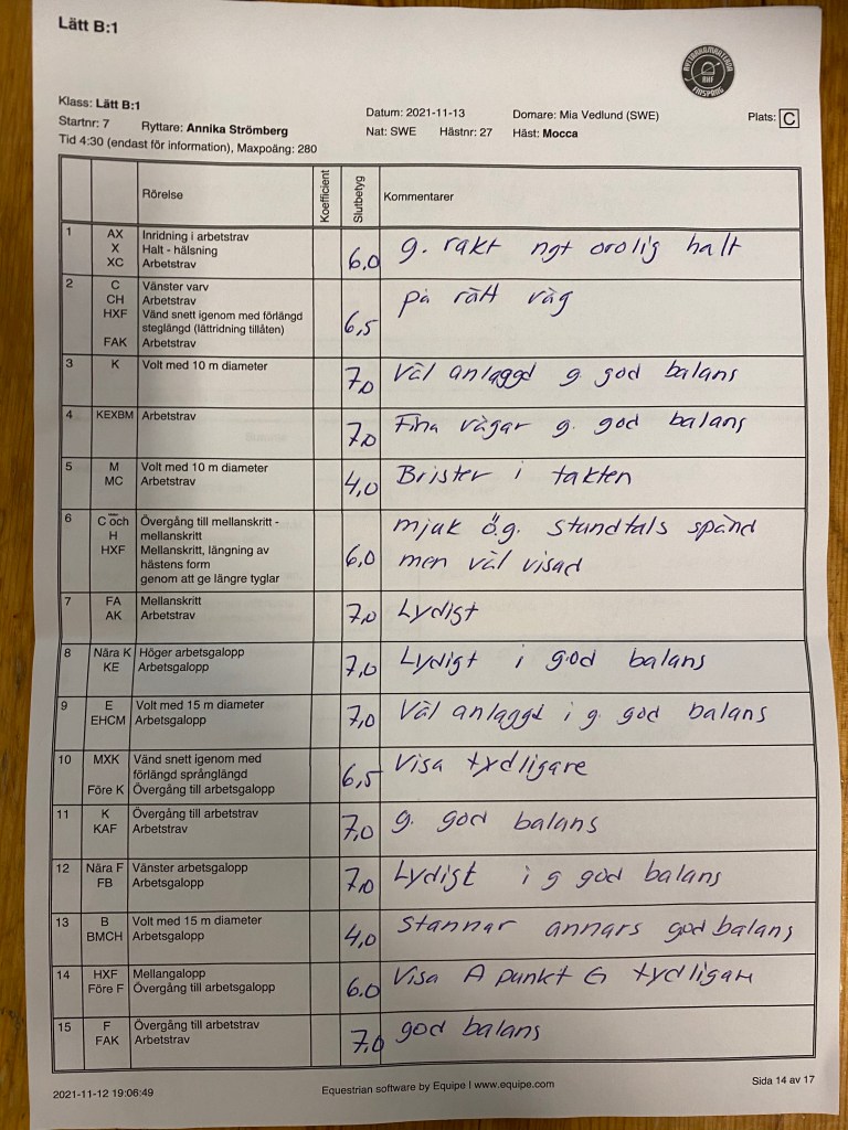 Mocca var lite tittig när jag lastade ur men hon gick ju utan problem hantera och göra klar själv. Så himla skönt! Skrittade till framridningen som var ute och joggade i alla gångarter, red lite sidvärts i trav för att lösgöra lite. Mycket galoppfattningar och övergångar mellan gångarterna och tempoväxlingar . Lite samma tänk som på träningarna- hitta mera avspänning genom ryggen så hon börjar trava jämnare och jag får ett bättre och jämnare stöd i handen.