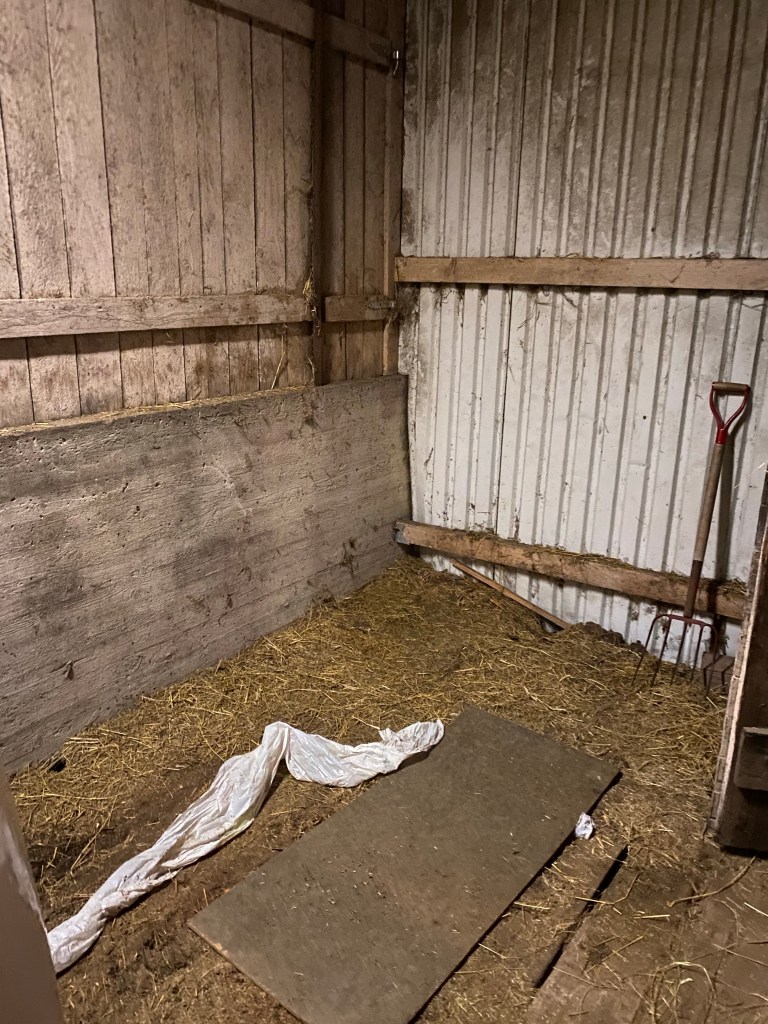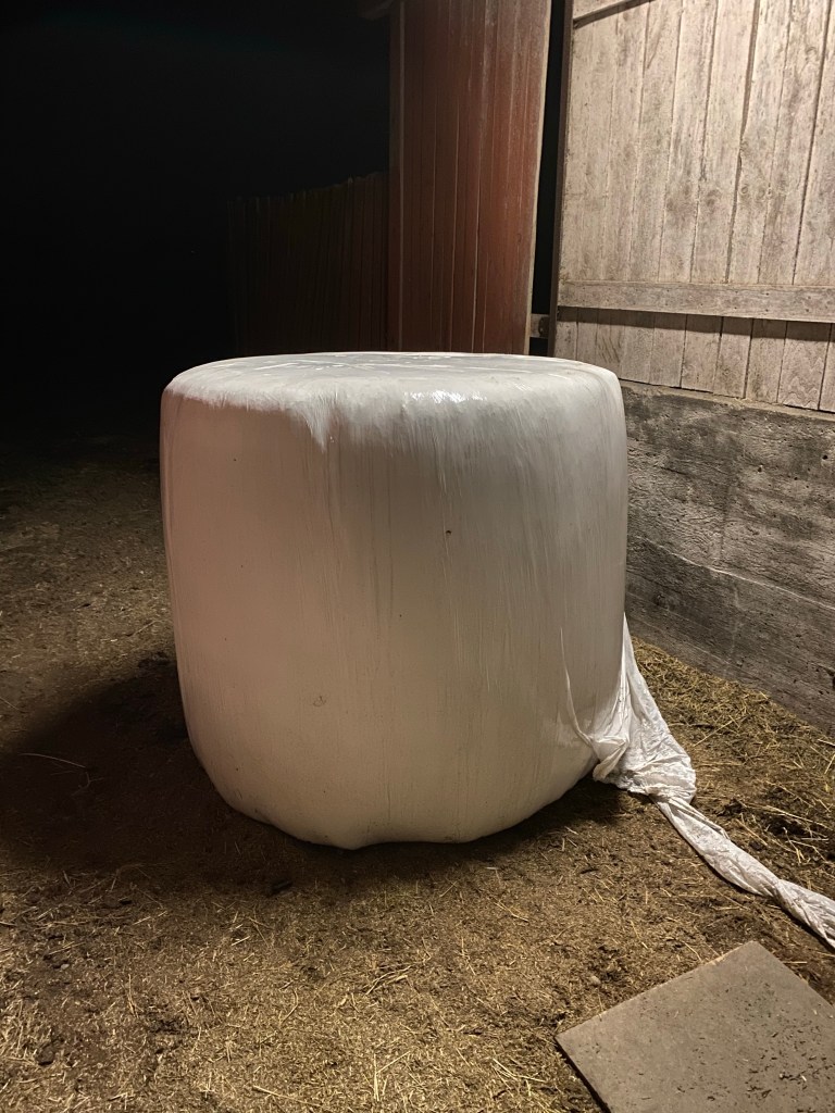 Vi kör in balarna i en ”fålla” under tak vid ena sidan av stallet, toppenbra ha balen under tak. Kan rulla in den också i stallet förstås men detta är så mycket smidigare. Och blir mindre skräpigt inne så här. 👍