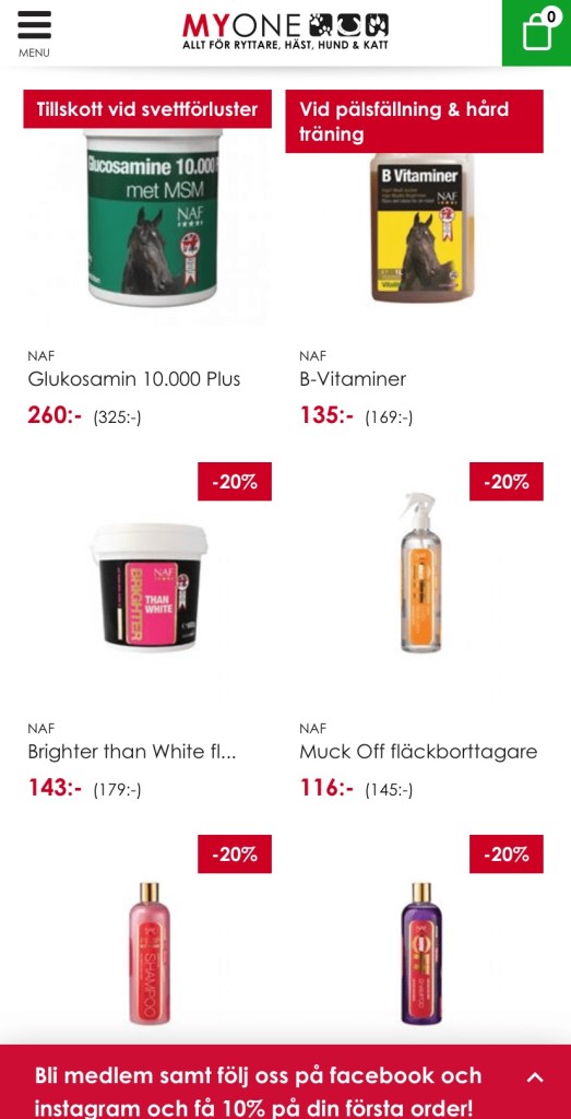 My One. Stooooor webbutik med massor av olika märken. Nu är det dessutom 20% rabatt på nästan allt inkl fodertillskott, så då kan man ju gärna passa på handla sådant lite billigare om det ändå går åt. 😁 Tex har de NAFs produkter och massa annat. Sen är det massor med ridkläder till jätterabatt, men lite beroende på vilken storlek man har då förstås.